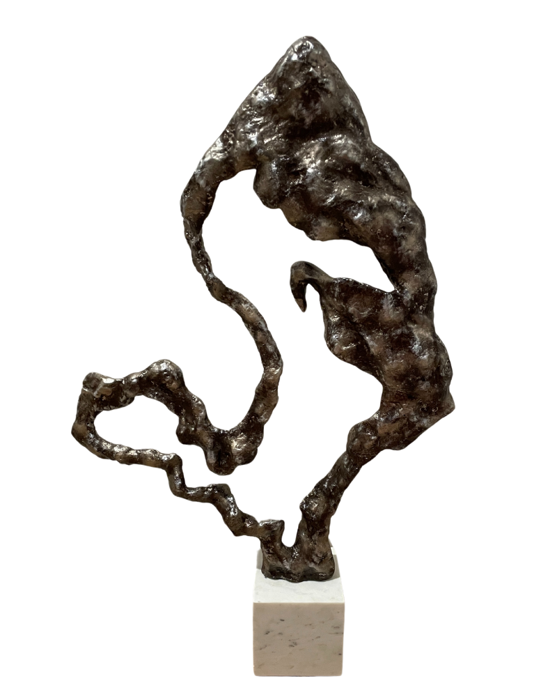 This striking sculpture captures the beauty of organic movement, now elevated with a custom silver and gold gilded finish. Hand-applied metallic tones accentuate the dramatic curves of the freeform silhouette, giving it a renewed depth and radiant presence. Perched on a raw white marble base, the contrast between luminous texture and earthy material creates a showstopping piece worthy of a gallery setting. Designed as a one-of-a-kind custom finish, this sculpture brings timeless artistry and elevated craftsmanship to your space.