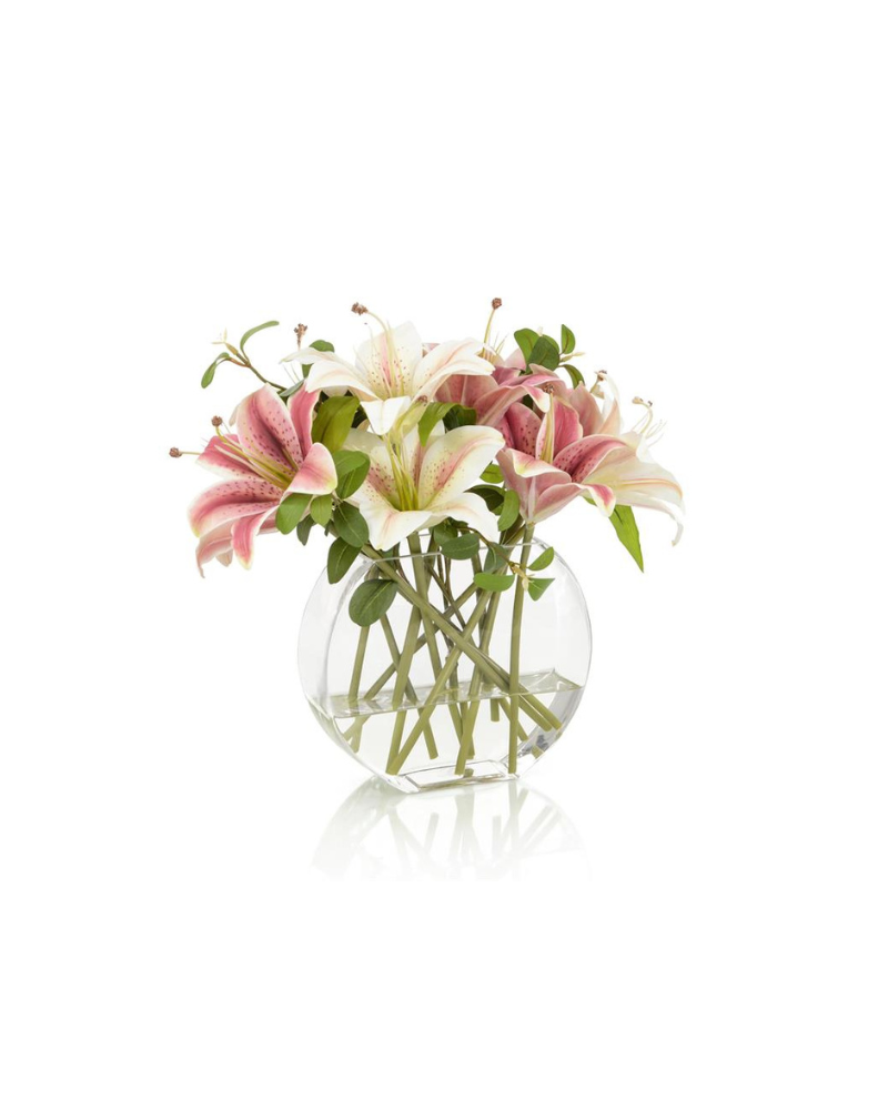 Stargazer features pale white and fuchsia pink artificial garden lilies that rest within a rectangular clear glass vase with rounded edges.